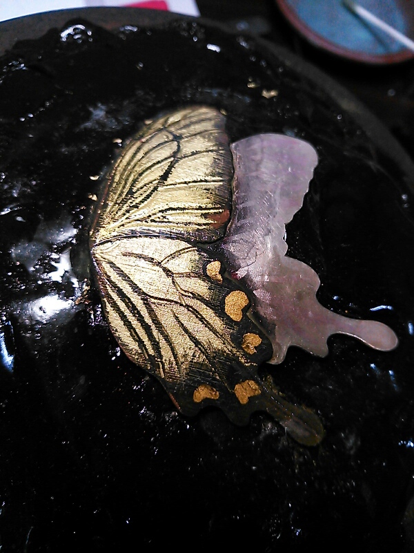 今はアゲハチョウのペンダント兼ブローチを作っています。そろそろ仕上げねば。